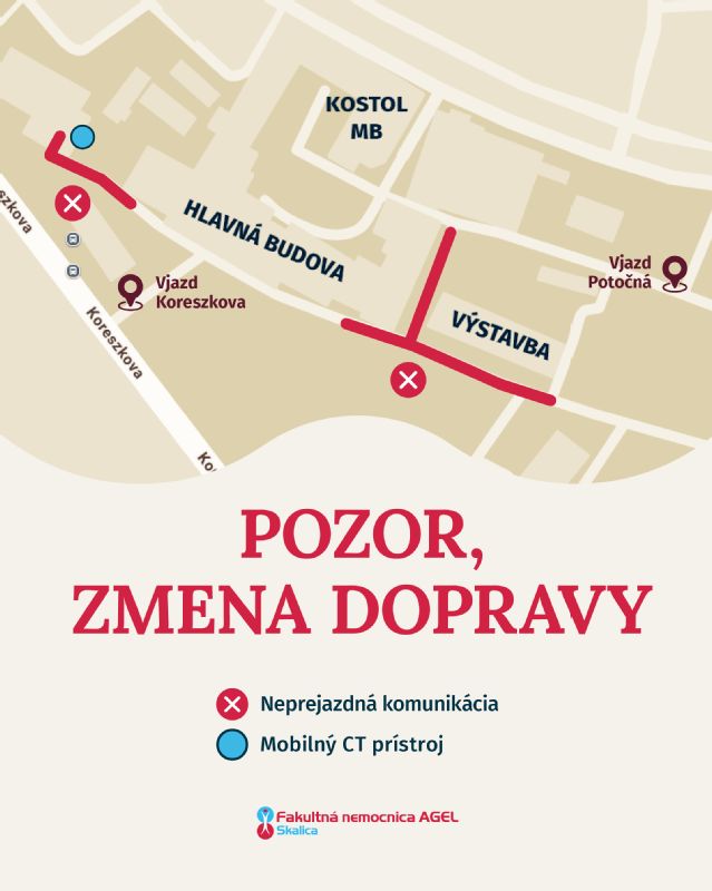 Areál nemocnice zostane neprejazdný z Koreszkovej na Potočnú ulicu, rovnako nebude možný prejazd z Koreszkovej ulice k pavilónom onkológie a lekárne. Vozidlá smerujúce k pavilónom onkológie a pľúcnej ambulancie, pavilónu lekárne, pediatrie, pôrodnice a detskej pohotovosti budú využívať prístup z Potočnej ulice. Naďalej ostáva v platnosti aj obmedzenie prejazdu od stanice ZZS k pavilónu OKBH a dialýzy, ktoré súvisí s umiestnením mobilného CT pracoviska pri garáži urgentného príjmu. Toto obmedzenie potrvá do ukončenia rekonštrukcie CT pracoviska.